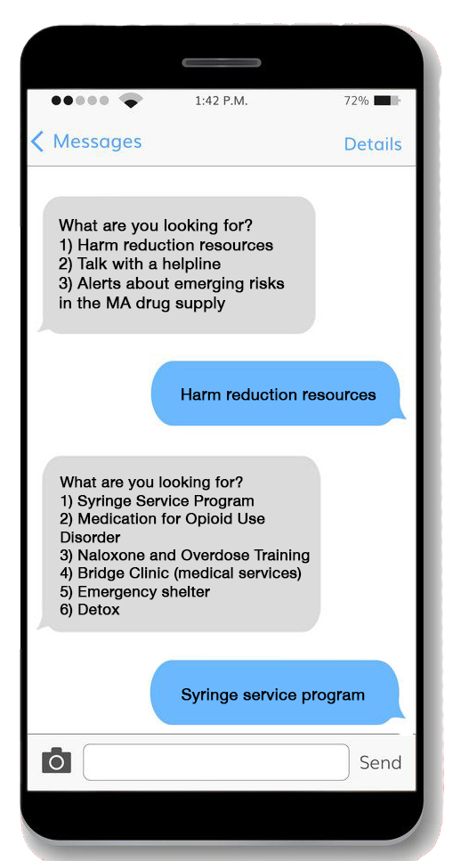 This SMS-based TextBot allows anyone to learn about harm reduction resources, simply by texting a phone number! The SMS interface makes it easy to navigate information about Syringe Services Programs, Naloxone and Overdose Training, Shelter, and more. App users can find address information and a phone number to contact. The TextBot is free and the newest update connects people to helplines! This is NOT artificial intelligence like ChatGPT but a simpler design like old AOL Instant Messenger bots.